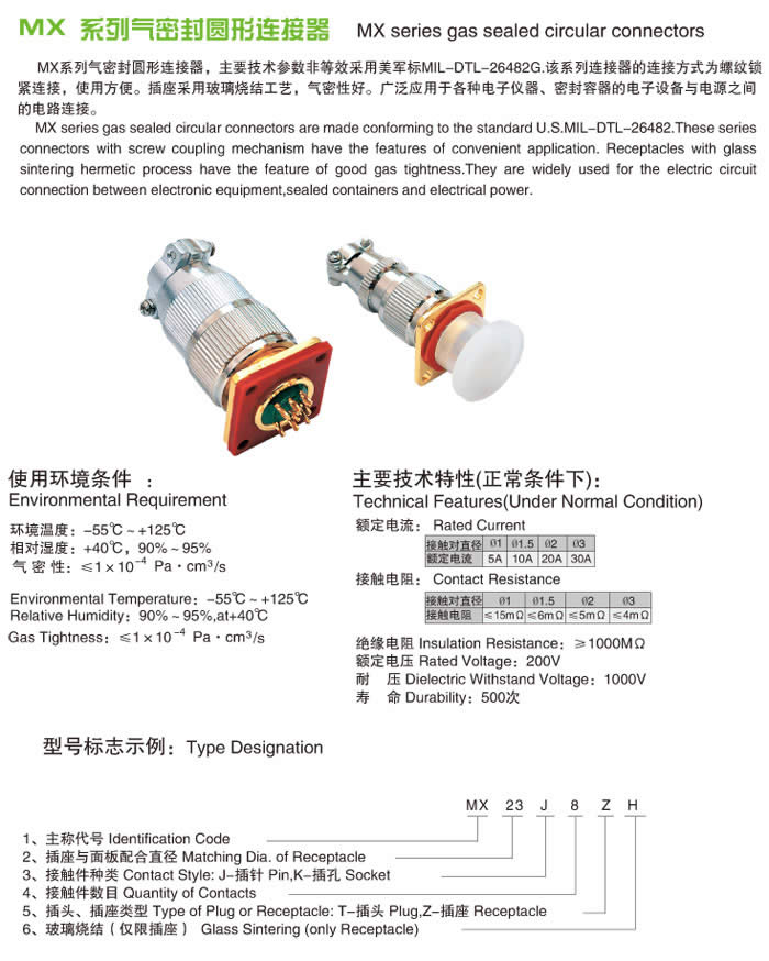 MX系列氣密封圓形連接器,主要技術參數非等效采用美軍標MIL-C-26482G。 供航空,航海及其他密封容器中電子設備與電源.電氣間連接,導線與電纜間電氣連接用。連接方式為螺紋連接鎖緊機構,使用方便。插座采用玻璃燒結工藝,氣密封性高,屬于儀器式電連接器。