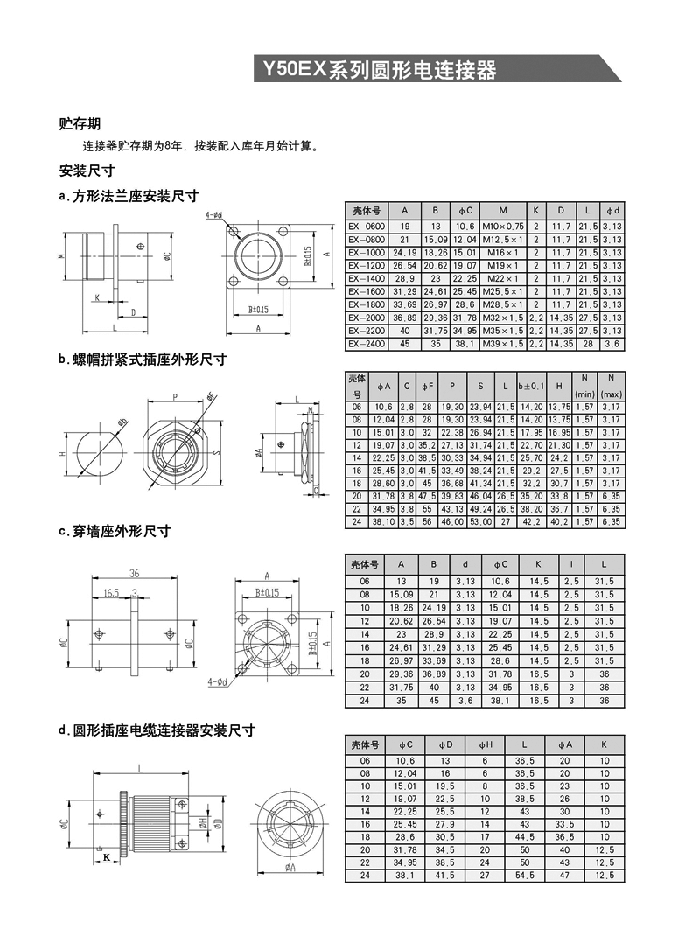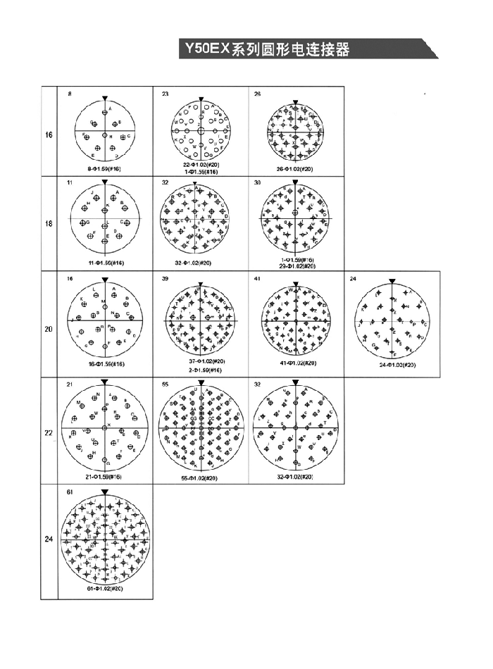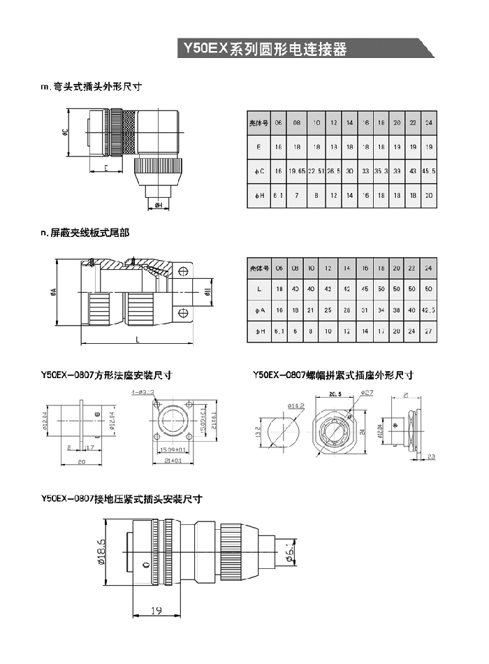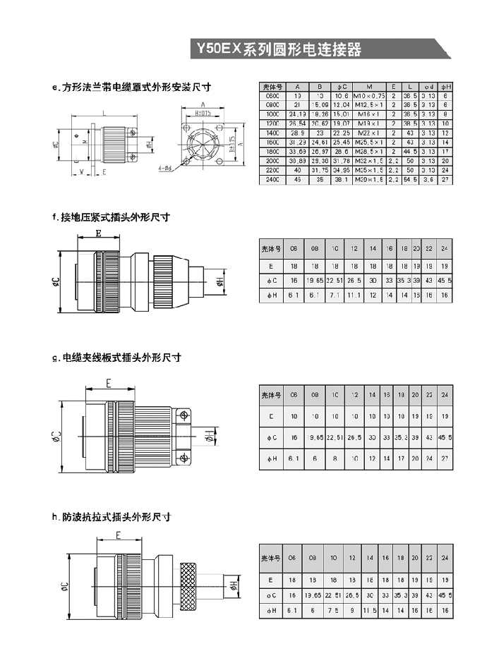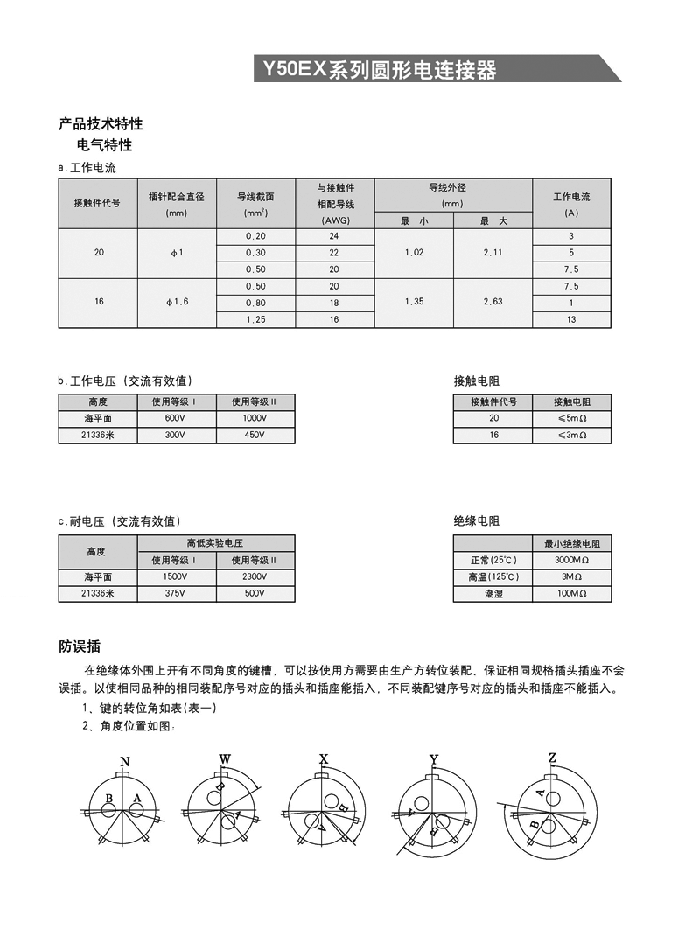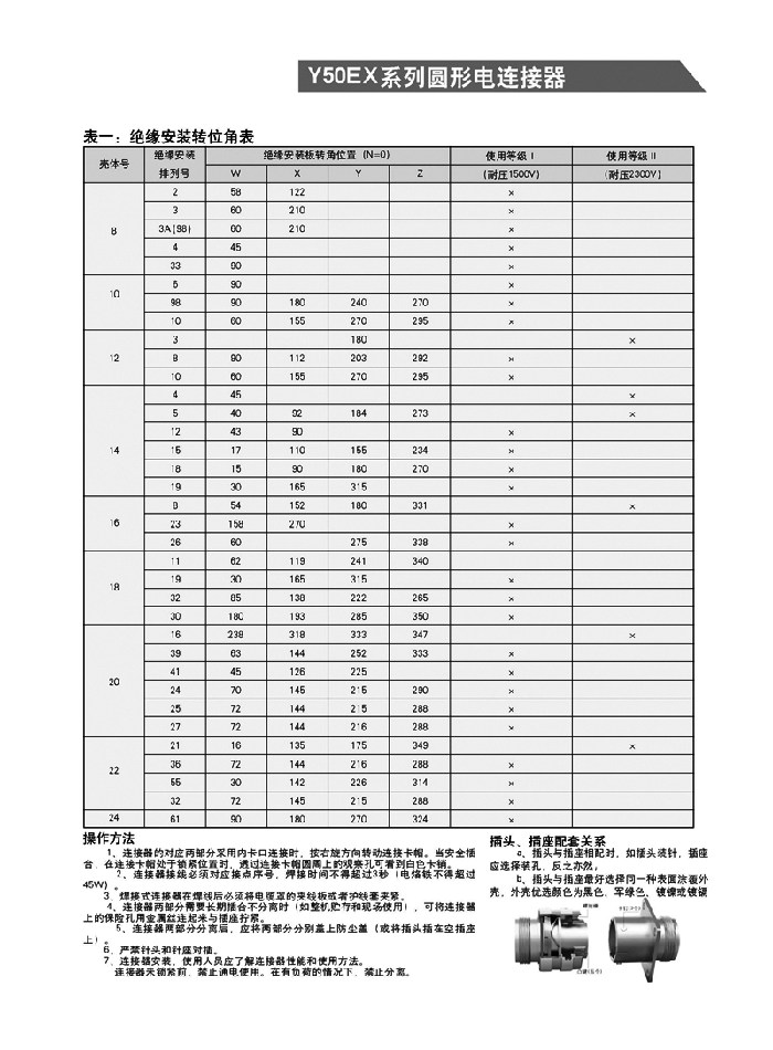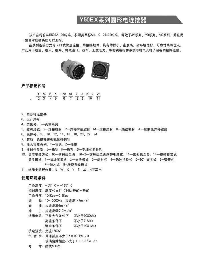 Y50EX系列圓形航空頭采用卡口式連接系統,具有快速控接和快速分離,體積小、重量輕等特點。插頭有多種電纜安裝形式,即:電纜夾線板式、簡易封裝式、接地壓緊式、防波抗拉式、彎頭護線式、電纜話筒式和彈簧護線式等。電纜出線口備有各種規格不同的密封橡膠護線縣,能與電纜線緊密配接,增強了電纜線和連接器插頭的防雨、防水、防塵密封性和抗拉性能。接觸件焊接,殼體有屏蔽和非屏蔽以及多種鍍層可選,插座有一般密封和玻璃燒結密封等類觀,以適用不同的工作環境。適用于戰略戰術系統,電子對抗系統,野外作業電能,通訊信號連接系統,航大航空航海通訊和測試跟蹤系統,計算機系統、郵電鐵路指揮系統,進口醫療儀器設備等電能、電訊信號的近接。