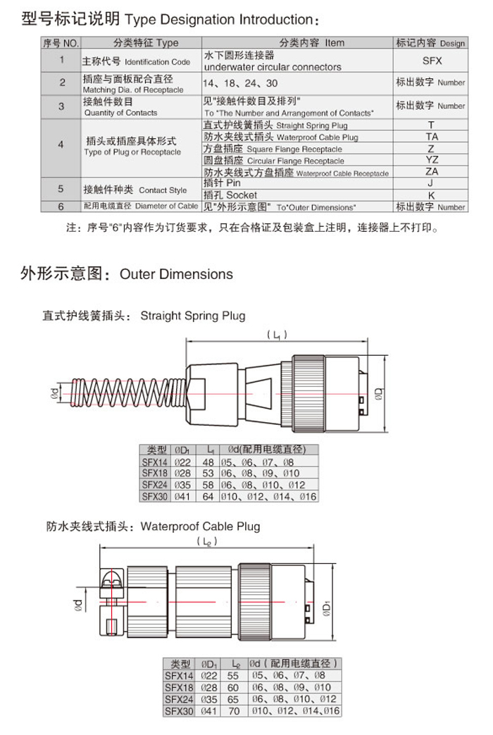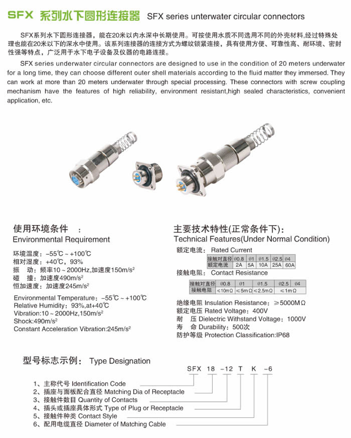 SFX型水密航空插頭座,能在20米以內(nèi)水深中使用的,可按使用水質(zhì)不同選用不同的外殼材料,經(jīng)過特殊處理也能在20米以下的深水中使用。該系列連接器的連接方式為螺紋鎖緊連接,具有使用方便、可靠性高、耐環(huán)境、密封性強(qiáng)等特點(diǎn),廣泛用于水下電子設(shè)備及儀器的電路連接。(SFX是螺紋連接,并且在FQN型的基礎(chǔ)上作了必要的加強(qiáng)。SFX型水下連接器的尾部附件,推薦差用FQN型的A型夾線板式,因?yàn)橛糜谒滤煽俊EcFQN相比,F(xiàn)QN的優(yōu)勢是:快速分離與連接和防自動脫落。SFX型的優(yōu)勢是:防水可靠和堅(jiān)固耐用。)http://m.bhcyw.cn