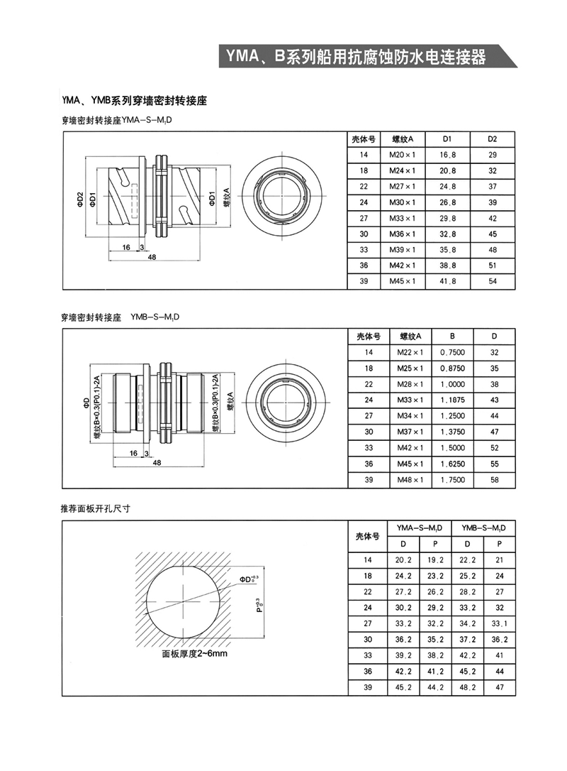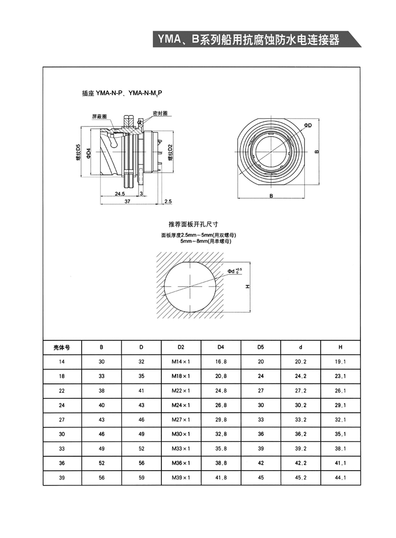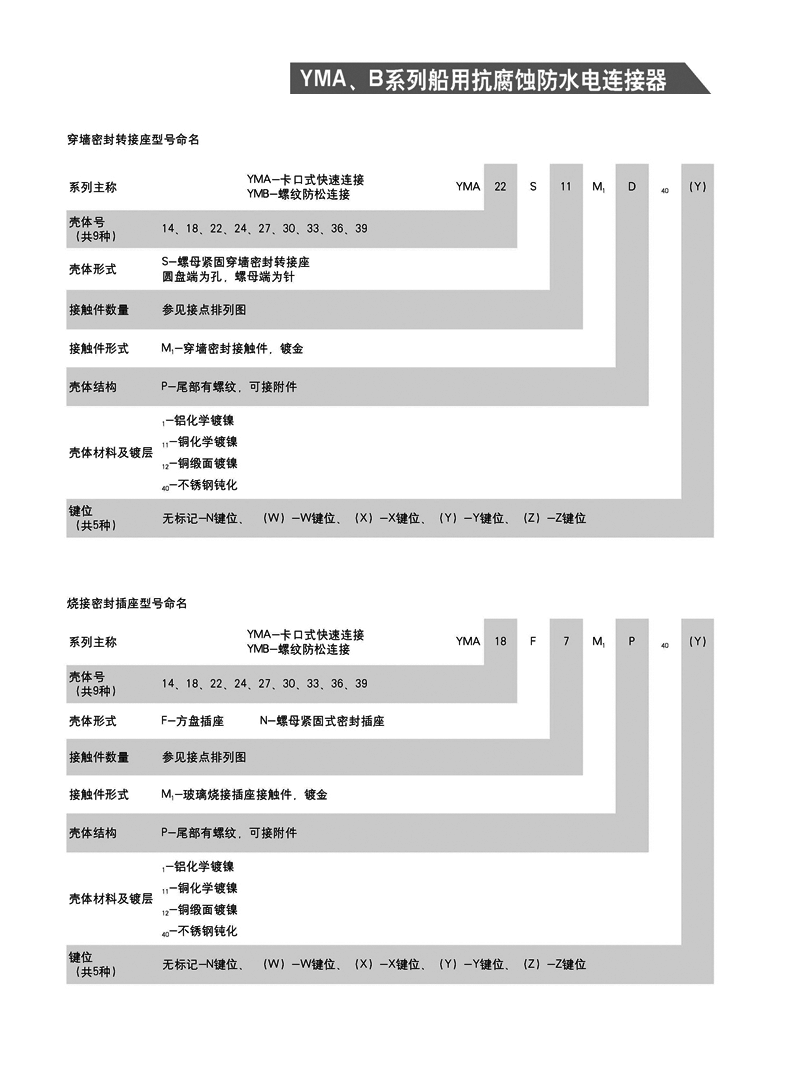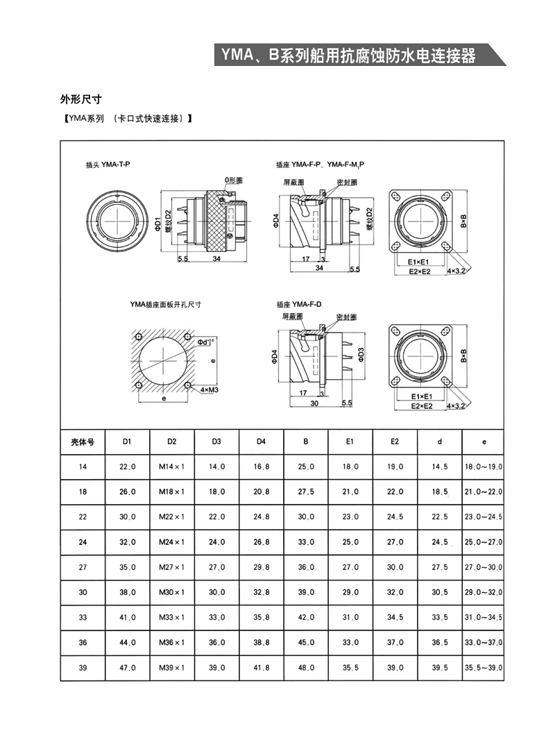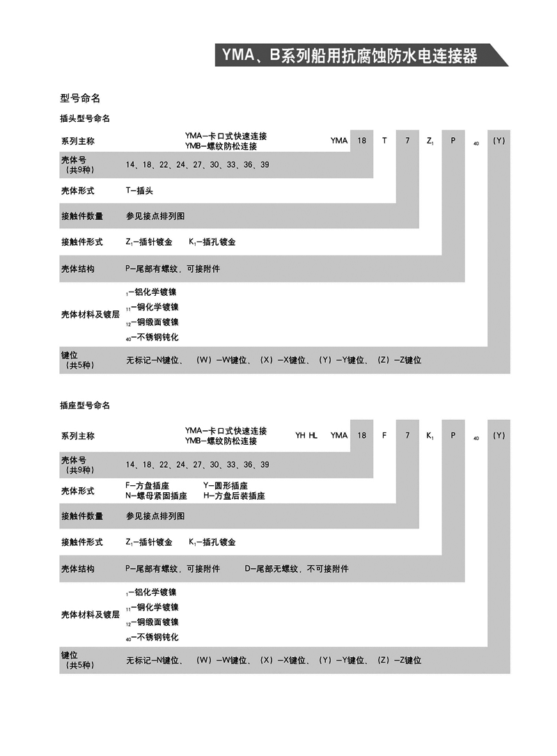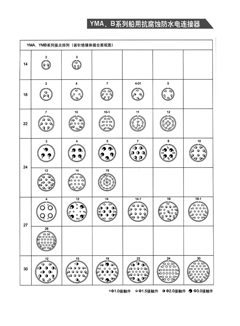 YMA YMB圓形防水防腐航空插頭,適用于濕熱、浸水等惡劣環境,可耐50米水深密封,耐1000小時鹽霧試驗:YMA系列為卡口式快速連接,YMB系列為螺紋防松連接,頭座均為焊接。 YMA、YMB系列船用抗腐蝕防水電連接器 1.【概 述】 * YMA系列—— 卡口式快速連接 * YMB系列—— 螺紋防松連接 * 適用于潮濕、浸水等惡劣環境下的設備與電纜、電纜與電 纜之間的電氣連接 * 可耐50米水深密封 * 插頭插座端接方式均為焊接 * 五鍵定位具有盲插和防錯插功能 * 高可靠的雙曲面線簧插孔使連接器插拔柔和,接觸電阻小 * 插頭、插座既可裝針,也可裝孔 http://m.bhcyw.cn/Product/yuanxinghangkongchatouhangkongjiechajian/