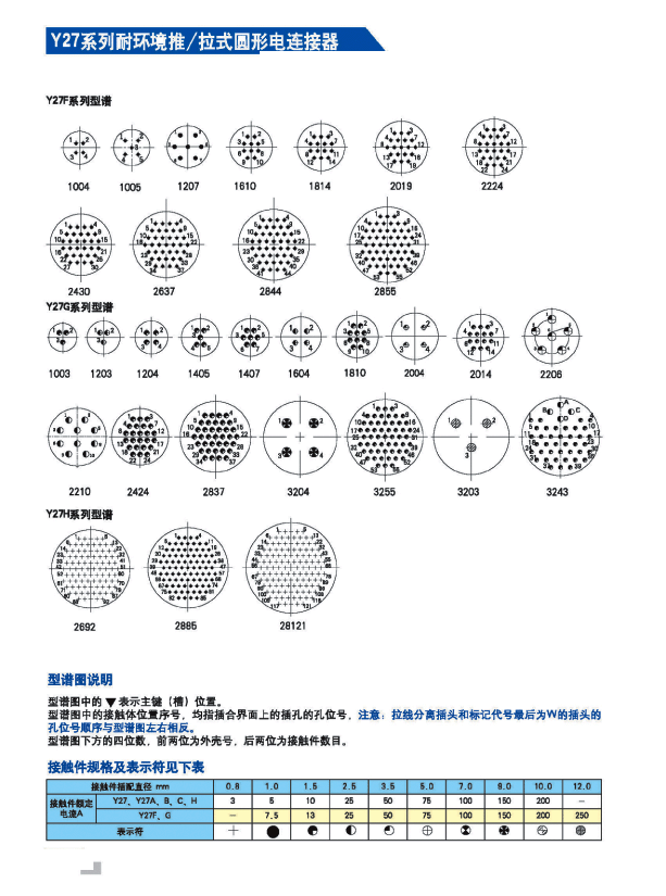 Y27G圓形推拉防水電連接器,采用推/拉式鎖緊機構; 連接可靠,連接和分離方便、快捷,適用于盲目插合或其它插合情況; 具有抗振動、防鹽霧、防電磁干擾、防塵、防雨及氣體密封等性能; 共有13 種殼體號,1~121 等18 種芯數,有3~250A 等10 種電流規格; 材料為鋁合金、海軍黃銅和不銹鋼三種; Y27F、G、H 系列電連接器適用于艦船環境,具有防水密封的性能; Y27H 系列電連接器采用雙曲線插孔; 符合國家軍用標準GJB2905-97,性能參照美軍標MIL-C-38999。http://m.bhcyw.cn/Product/dadianliuhangkongchatoudianlianjieqi/