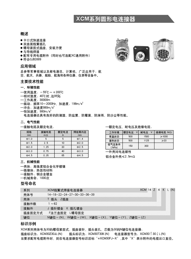 XCM系列螺母拼緊式航空插座,XCM系列航空插頭采用卡口式快速連接和分離;雙曲面線簧插孔,插拔柔和;螺母緊固式插座,安裝方便;接觸件為焊接式,配有專(zhuān)用電纜附件;同時(shí)也可選配XC通用附件,符合GJB2889標(biāo)準(zhǔn)。廣泛應(yīng)用于航空、航天、兵器、艦船、總參等軍事領(lǐng)域以及郵電通訊、計(jì)算機(jī)、航海和各種儀器、儀表等設(shè)備中。