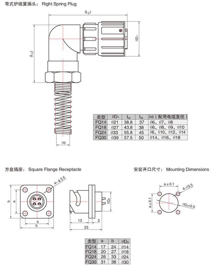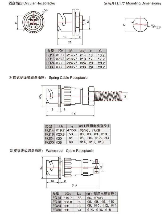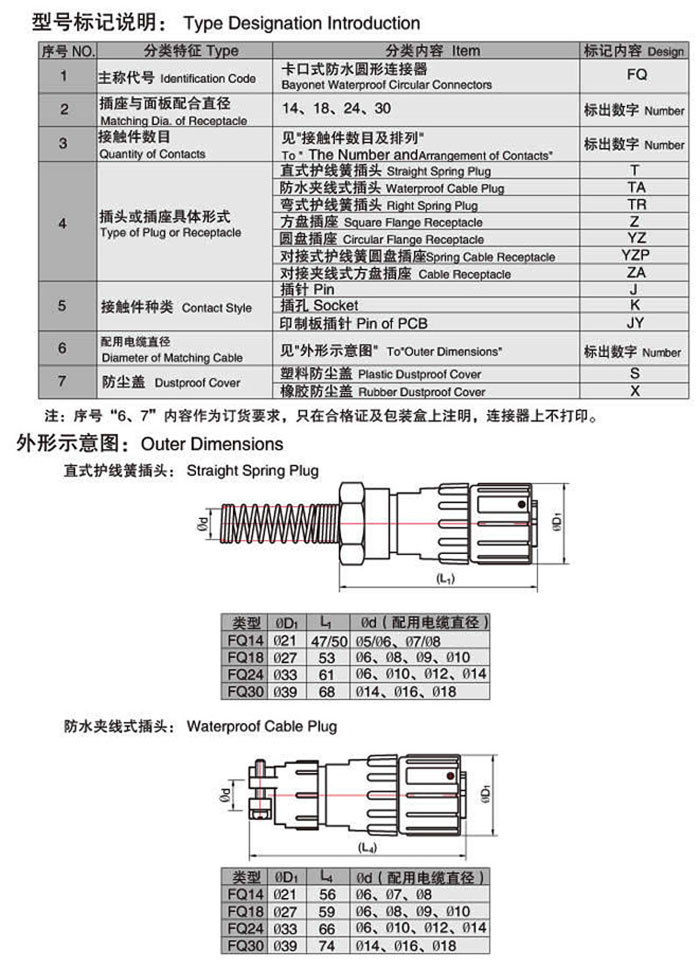 FQ-1803ZJ/TK圓形防水電連接器,接觸件3芯,2.5mm針孔,額定電流可達30A,螺旋卡口連接,插頭與插座之間有密封圈設計,增加防水功能,插頭尾巴有直式和彎式,夾線防水尾部,出線孔徑客戶可選擇,訂貨數量多,可以定做不同大小的電纜罩。