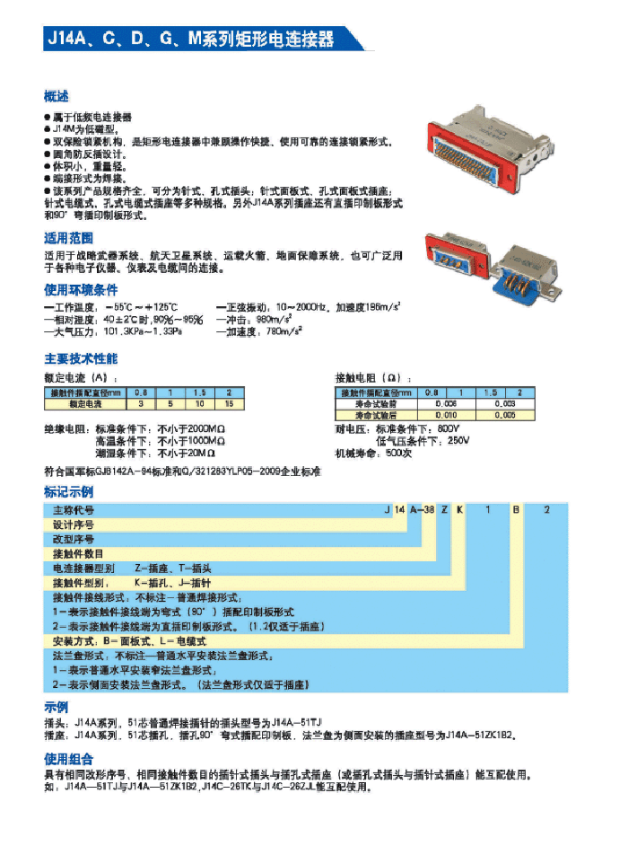 J14A-20ZK1B2/TJL矩形航空插頭,是符合GJB142A-94標(biāo)準(zhǔn),屬于低頻電連接器。J14A是主稱代號,20表示接插件數(shù)目,Z表示插座,K表示插孔,K1表示接觸件接線端為彎式(90°)插配印制板形式。B2表示側(cè)面安裝法蘭盤插座。
