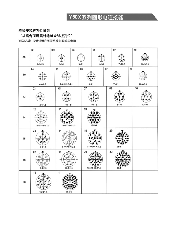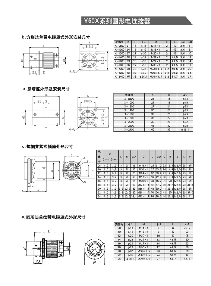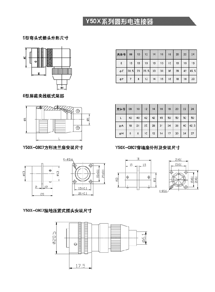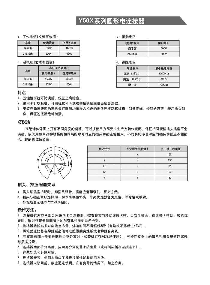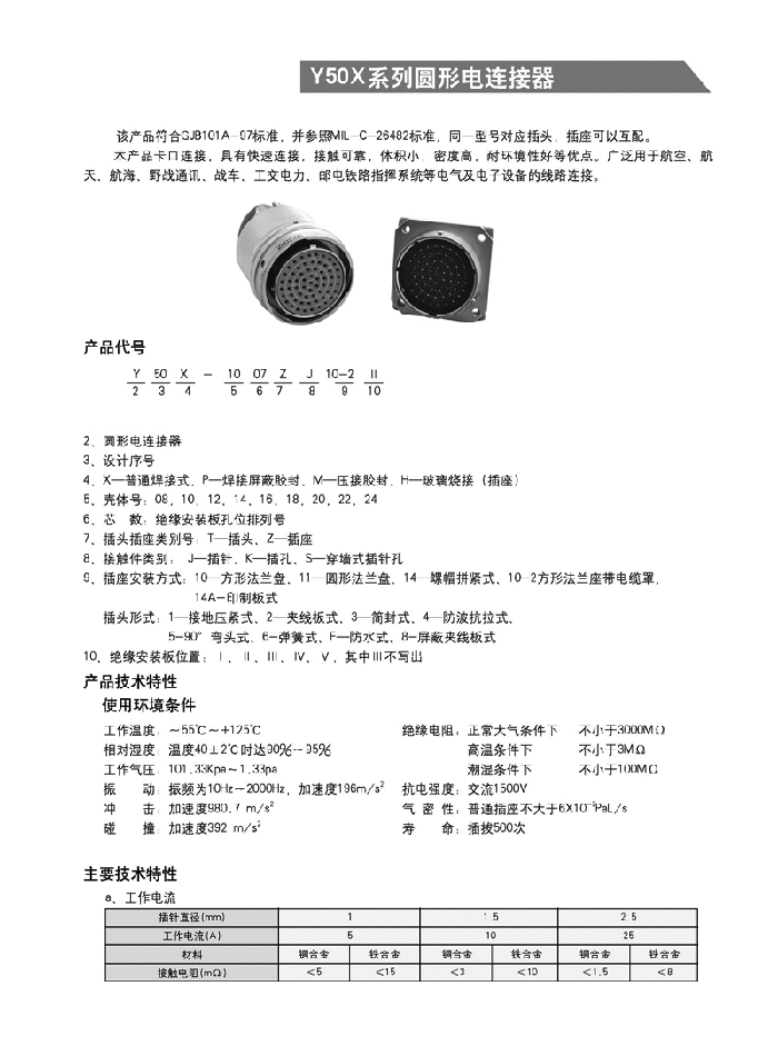 Y50系列航空插頭包括公制、英制、電源三大類電連接器。均為內(nèi)螺旋槽卡銷鎖緊式。具有快捷連接與分離,體積小、重量輕,密封性能好,抗拉性能優(yōu)之特點。插頭電纜罩有七種安裝方式,殼體分屏蔽與非屏蔽,電纜引出有直式和彎式,端接方式為焊接式。品種多,規(guī)格全。Y50X是公制航空插頭,相對體積要大些。而且該產(chǎn)品可根據(jù)用戶需求改裝成濾波連接器,真空氣密封連接器。 均參照GJB101A—97,GJB598A—96,MIL—C—26482等標準的要求。適用于戰(zhàn)略、戰(zhàn)術(shù)系統(tǒng),野外作業(yè)等電訊號、電能的連接。