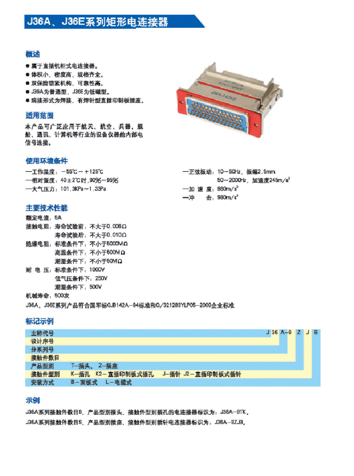 J36A/E矩形航空插頭執行Q/HD20038-2007詳細規范,屬于儀器式電連接器。具有體積小、密度高、規格齊全、雙保險鎖緊結構、可靠性高等優點,端接形式為焊接式和直插印制板式。廣泛應用于航天、航空、兵器、艦船、通訊、計算機等行業的設備儀器艙內部電信號連接。