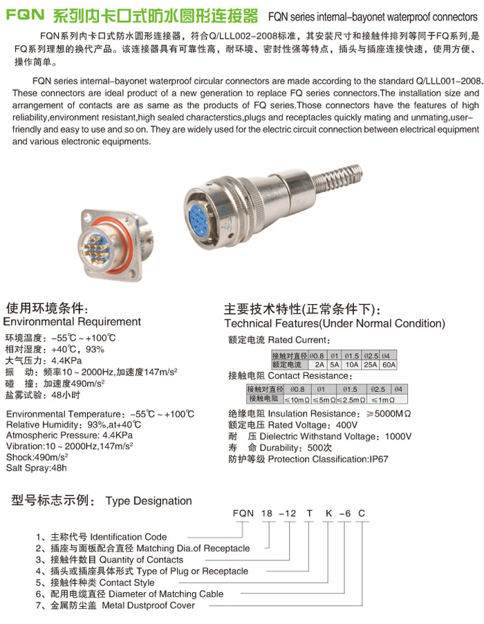 FQN系列內卡口式防水型圓形電連接器,符合Q/LLL002-2008標準,產品的安裝尺寸及接點型譜等同FQ和Q系列產品價格,是FQ系列產品價格的改進型。體積小,重量輕,內卡口快速連接,零件由鋁棒或銅棒車加工制造(非鋁壓鑄件),耐環境,防水、防鹽霧、防霉菌,操作使用簡便。插針、插孔引線采用焊接式。產品價格被廣泛使用于各種電子儀器、電子、電氣設備間有防水要求的電連接中。產品價格符合按鐵道部標準TB/T2761。產品價格針、孔可以根據您的要求互換。