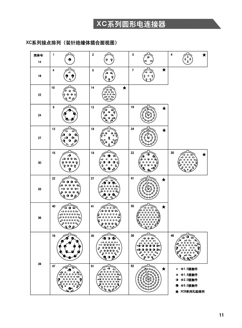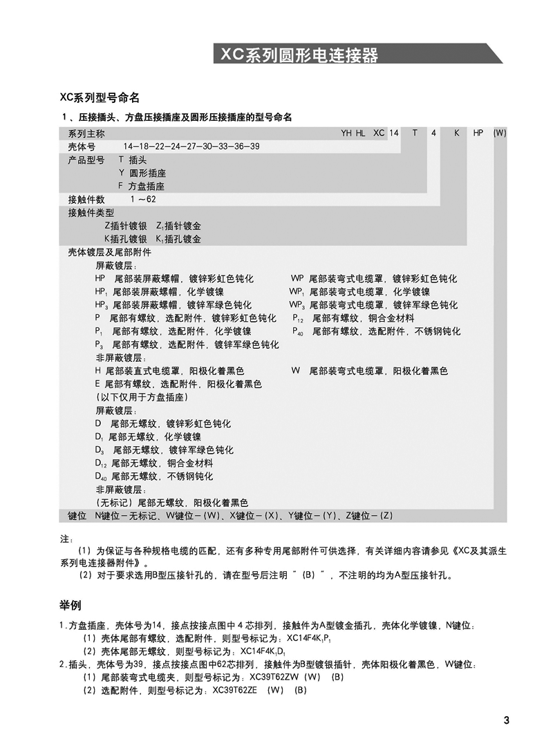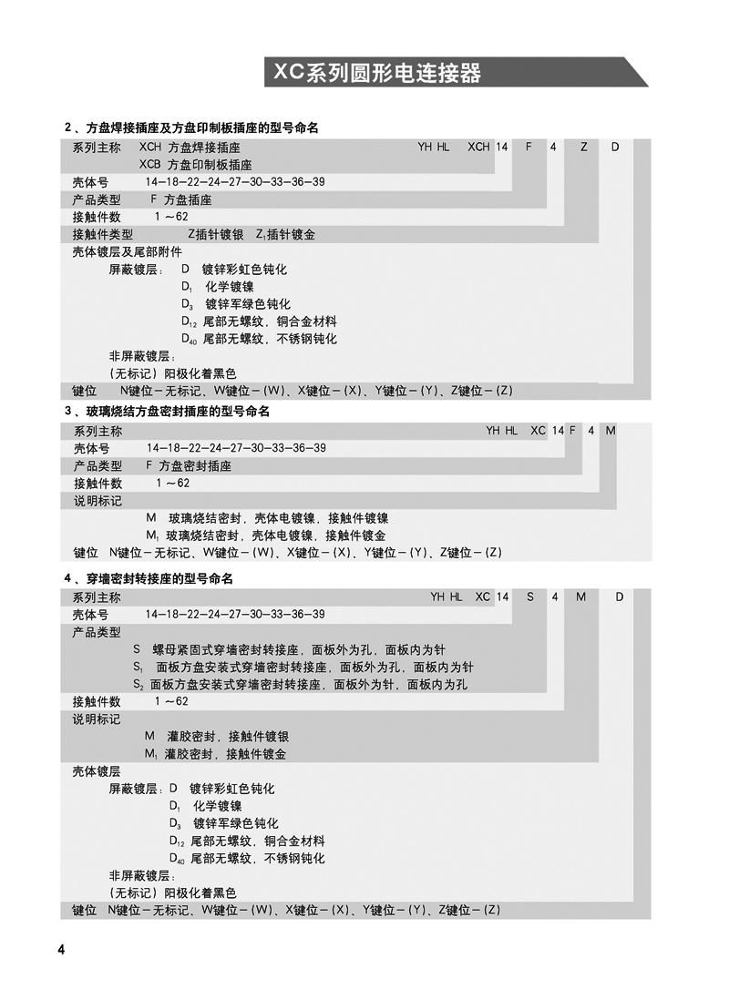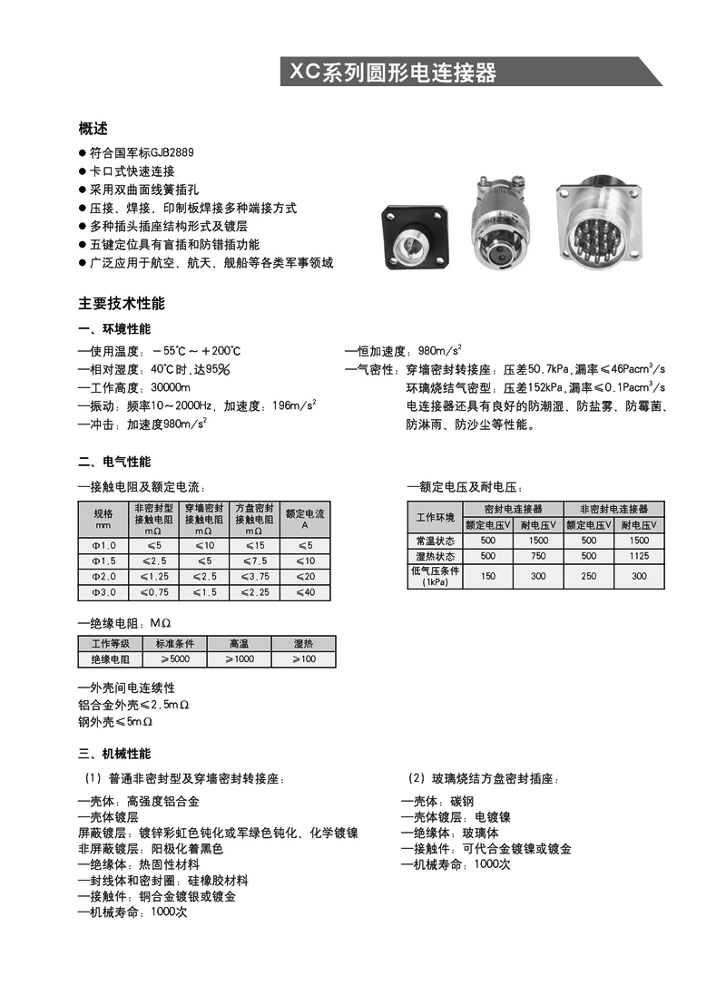 XC系列圓形航空插頭為低頻類電連接器。九種殼體號;4種接觸件規格;32種孔位排列。從1孔到62孔。采用卡口式快速連接系統,操作方便,連接可靠,耐振動,抗沖擊。五鍵槽定位,具有盲插和防誤插功能。高可靠的雙曲面線簧孔使連接器插拔柔和,接觸電阻小,工作可靠。插座共有五種結構形式選用。XC系列圓形線簧孔信號電連接器,符合國家軍用標準GJB2889。廣泛用于航天,航空,航海、鐵路、野戰通訊及各種儀器、儀表等設備中。