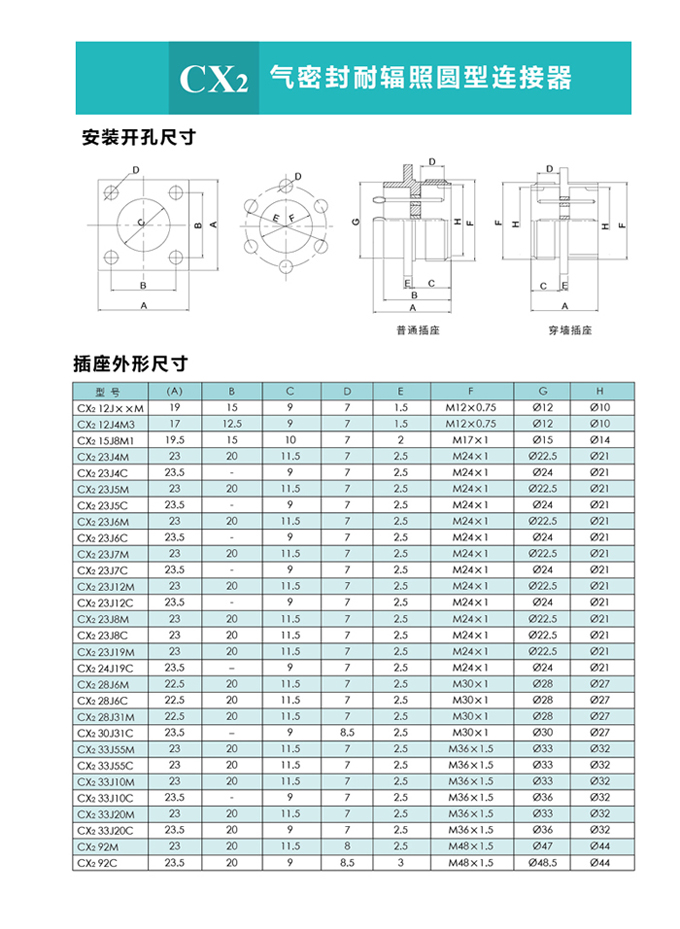 CX2系列8芯真空密封插座目前有七個殼體號,二十九個孔組數,有非密封、密封和密封穿墻等品種。尾部附件有直式壓線式、護線管式、彎式壓線式和屏蔽式四個品種;除以上四種形式的尾部附件外,還設計了 種尾部附件形式,供用戶選用。