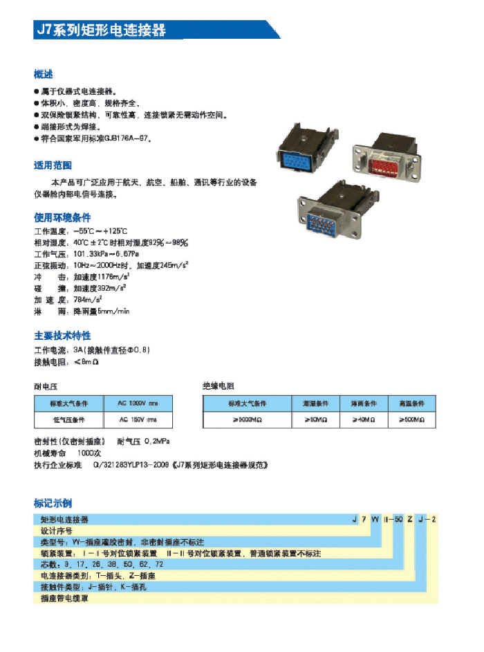 J7系列矩形航空插頭,認證采用的國家標準為GJB 176-86《耐環境線簧孔矩形電連接器總規范》。連接方式為直插連接,使用方便,可快速插拔。帶有獨特的雙重鎖緊機構,防雨,外殼屏幕,插座灌膠密封, 密封性(僅密封插座)耐氣壓0.2Mpa。體積小,重量輕。插孔采用高可靠性能插孔,插拔力小,使用壽命長。 J7系列矩形電連接器適用于各種電子儀器、電氣設備系統之間的電路連接。