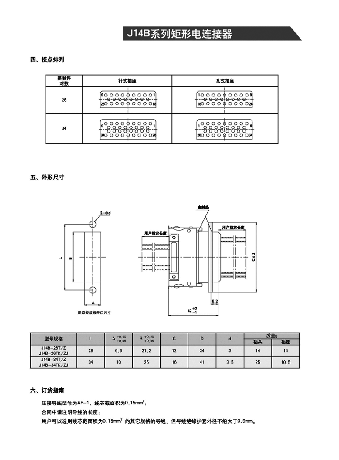 在J14A系列連接器外殼的基礎(chǔ)上,增加了接觸件的密度和防雨功能。帶電纜,端接形式為壓接,電纜規(guī)格和長(zhǎng)度由用戶確定。