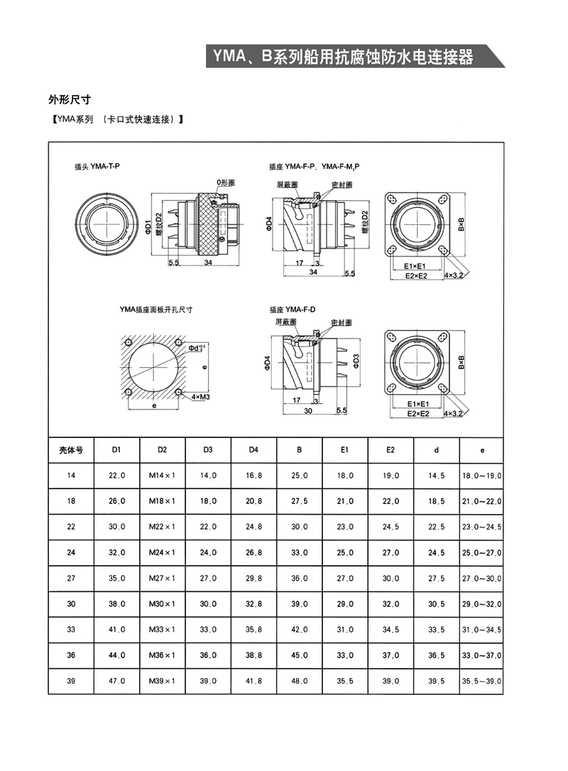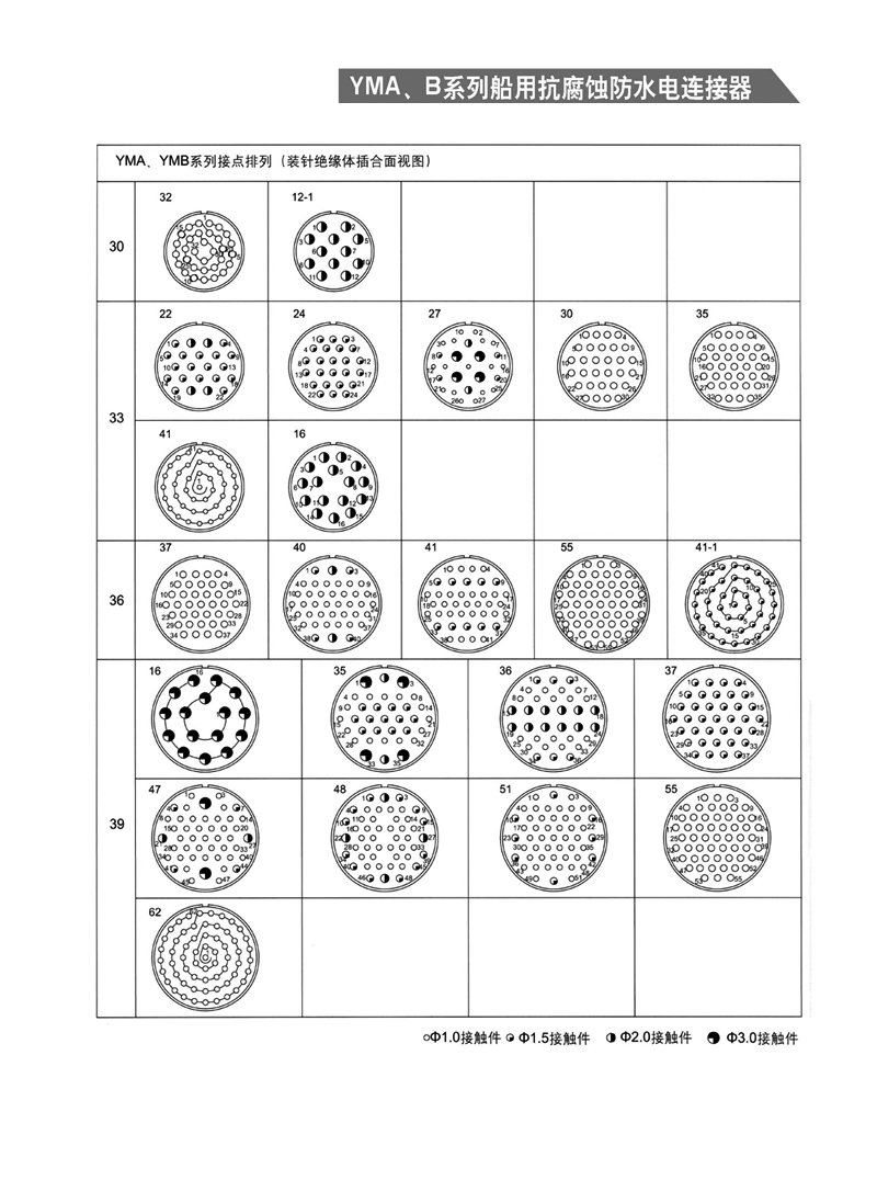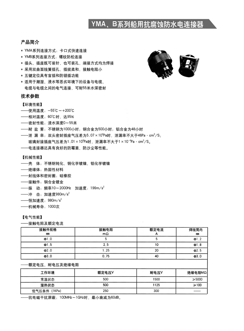YMA/YMA系列船用防水航空插頭適用于濕熱、浸水等惡劣環(huán)境,可耐50米水深密封,耐1000小時(shí)鹽霧試驗(yàn):YMA系列為卡口式快速連接,YMB系列為螺紋防松連接,頭座均為焊接。 適用于潮濕、浸水等惡劣環(huán)境下的設(shè)備與電纜、電纜與電纜之間的電氣連接。