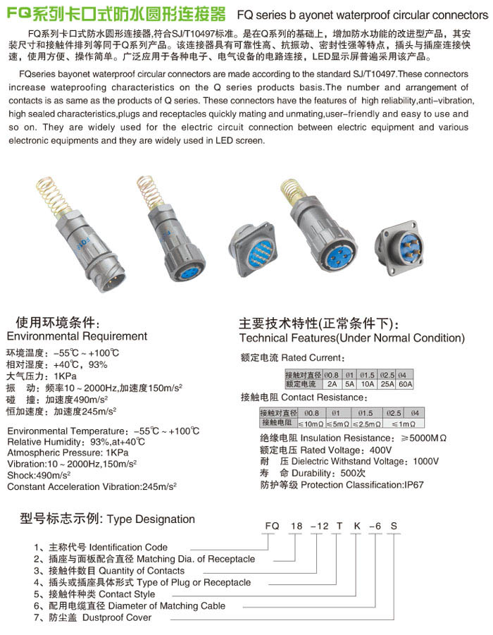 FQ 系列防水圓形電連接器符合電子工業(yè)部元器件工業(yè)管理局局標(biāo)準(zhǔn)DZ4Q/RE008-84制造,產(chǎn)品結(jié)構(gòu)先進(jìn),可靠性高,插孔接觸采用高可靠的鼠籠式彈性接觸代替?zhèn)鹘y(tǒng)的線簧結(jié)構(gòu),產(chǎn)品具有接觸電阻小、抗振動(dòng)、耐沖擊、密封性強(qiáng)等特點(diǎn),插頭座連接為卡口式快速連接,使用簡單,操作方便,被廣泛應(yīng)用于各種電子設(shè)備間的電氣連接。