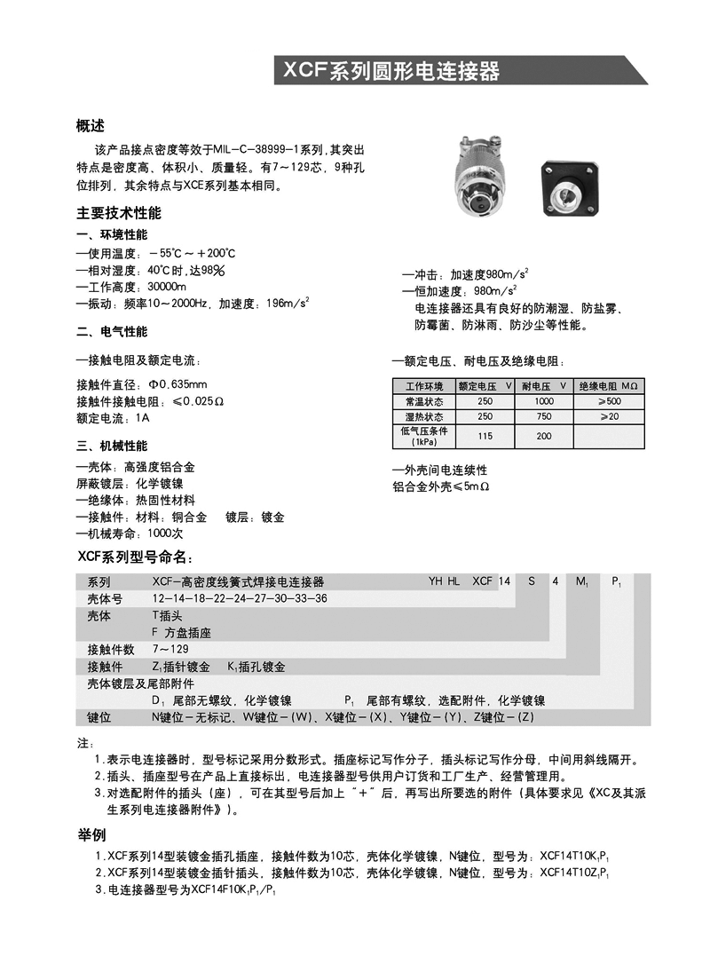 XCF系列高密度航空插頭, XCF系列軍用圓形電連接器 ,等效于MIL-C-38999-I系列標(biāo)準(zhǔn),具有密度高、體積小,重量輕等特點(diǎn),殼體為高強(qiáng)度鋁合金材料,插頭、插座既可裝針也可裝孔,其連接方式為卡口式快速連接和分離,操作方便,連接牢靠,抗振耐沖,接觸件有焊接式,其中插孔為線簧孔,具有插拔柔和、接觸電阻小、防潮、防鹽霧、防霉菌、防淋雨等特性,主要應(yīng)用于艦船等各種惡劣環(huán)境領(lǐng)域,也可應(yīng)用于航空、航天、兵器、野戰(zhàn)通信等軍事領(lǐng)域以及郵電通訊、鐵路指揮系統(tǒng)、計(jì)算機(jī)、航海和各種儀器、儀表的線路連接。